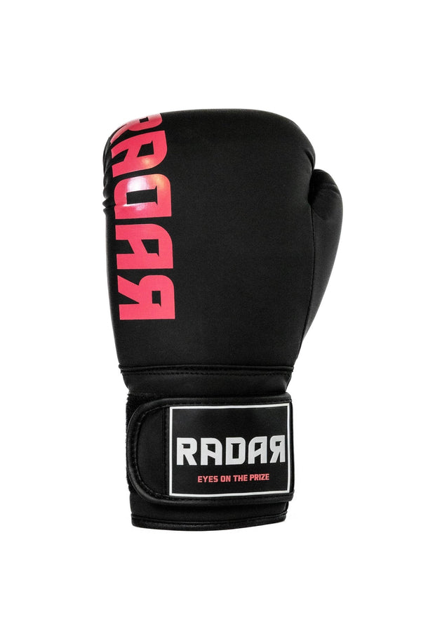 Deze zwarte bokshandschoenen met krachtig roze RADAR-logo en de slogan Eyes on the Prize zijn ontworpen voor sporters die weten wat ze willen. Comfortabel, duurzaam en stijlvol – ideaal voor kickboksen, bokszaktraining en sparren.