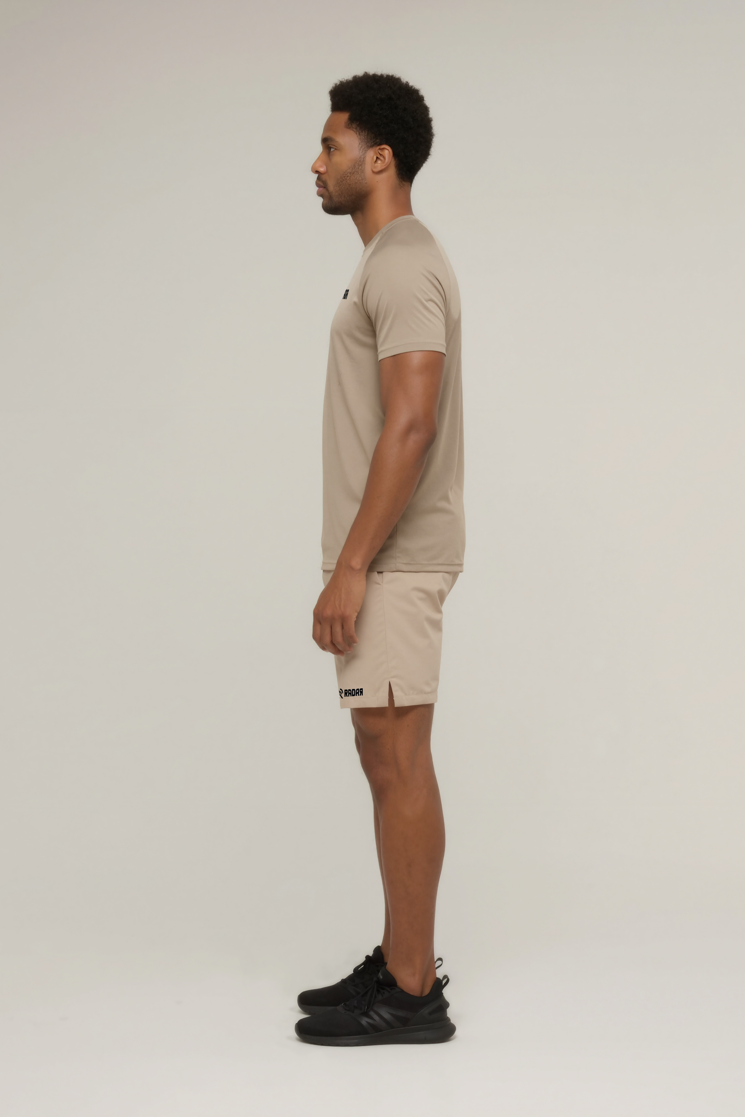 Radar Performance Shirt in zandkleur combineert tijdloos design met technische performance. Een lichtgewicht fitness t-shirt die je maximale bewegingsvrijheid geeft. Perfect voor krachttraining, HIIT, boksen, hardlopen en elke andere workout.